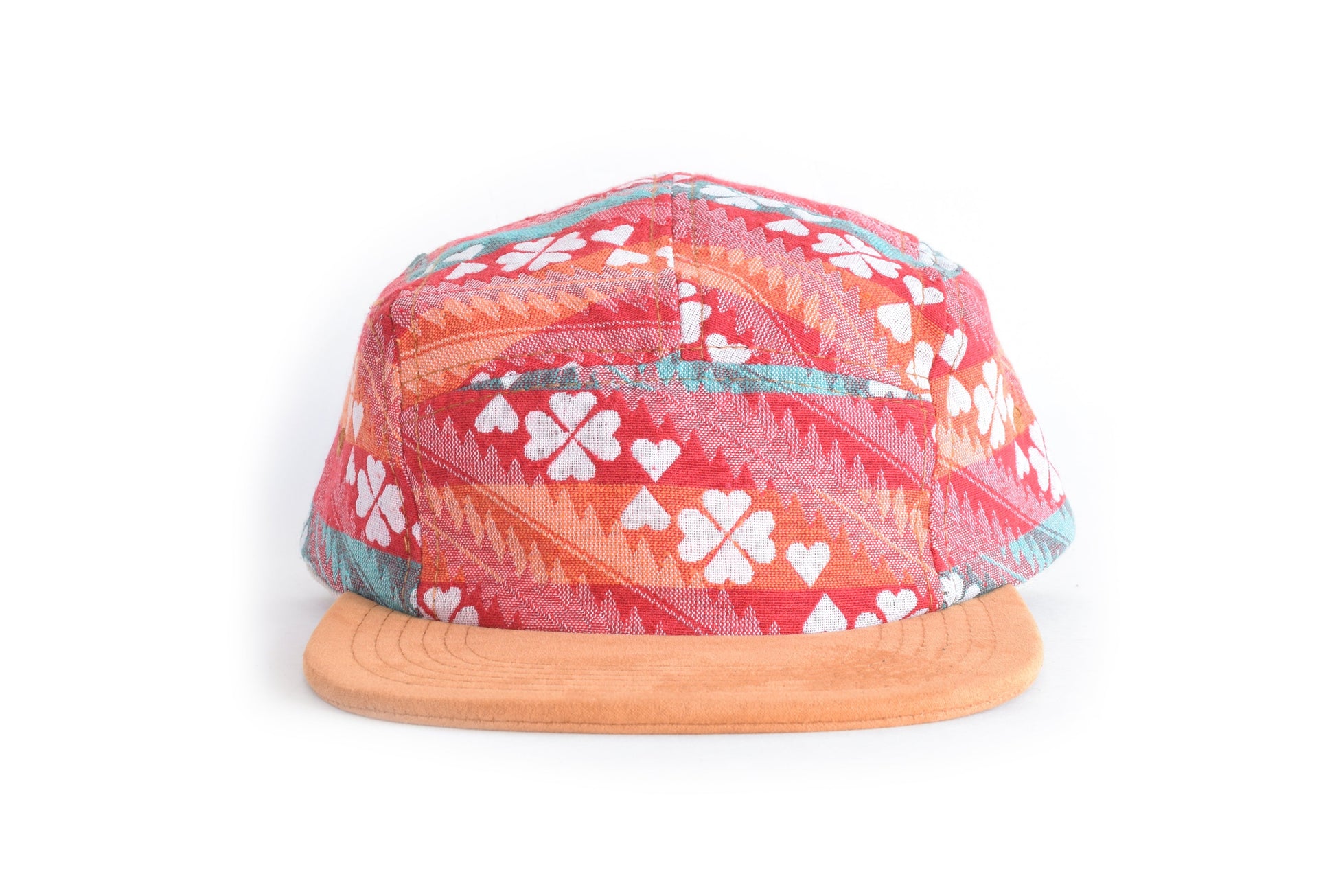 The Barah five panel hat (sb) is handmade with a textile from Nepal. Every year the Nepali come out with new patterns and color variations on their traditional textiles. We try to grab a handful each year. This textile was hand woven in Kathmandu in  2025.