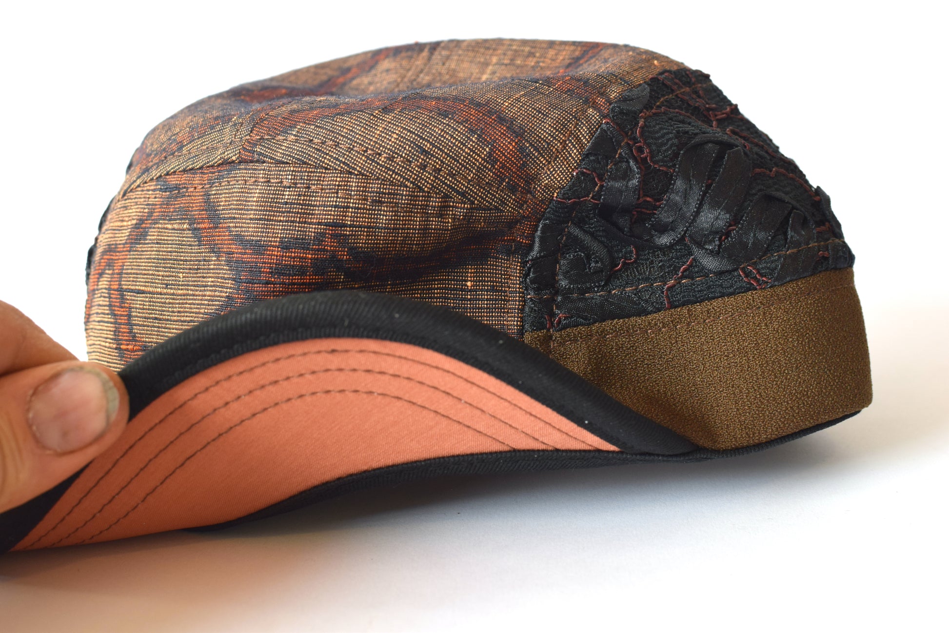 The Matsudo five-panel (sb) hat  is handmade with a thin, silk, kimono textile from Japan. Soft curve brim, lightweight construction makes this hat perfect for running. Quick dry fabrics for exercising, machine washable for cleaning.