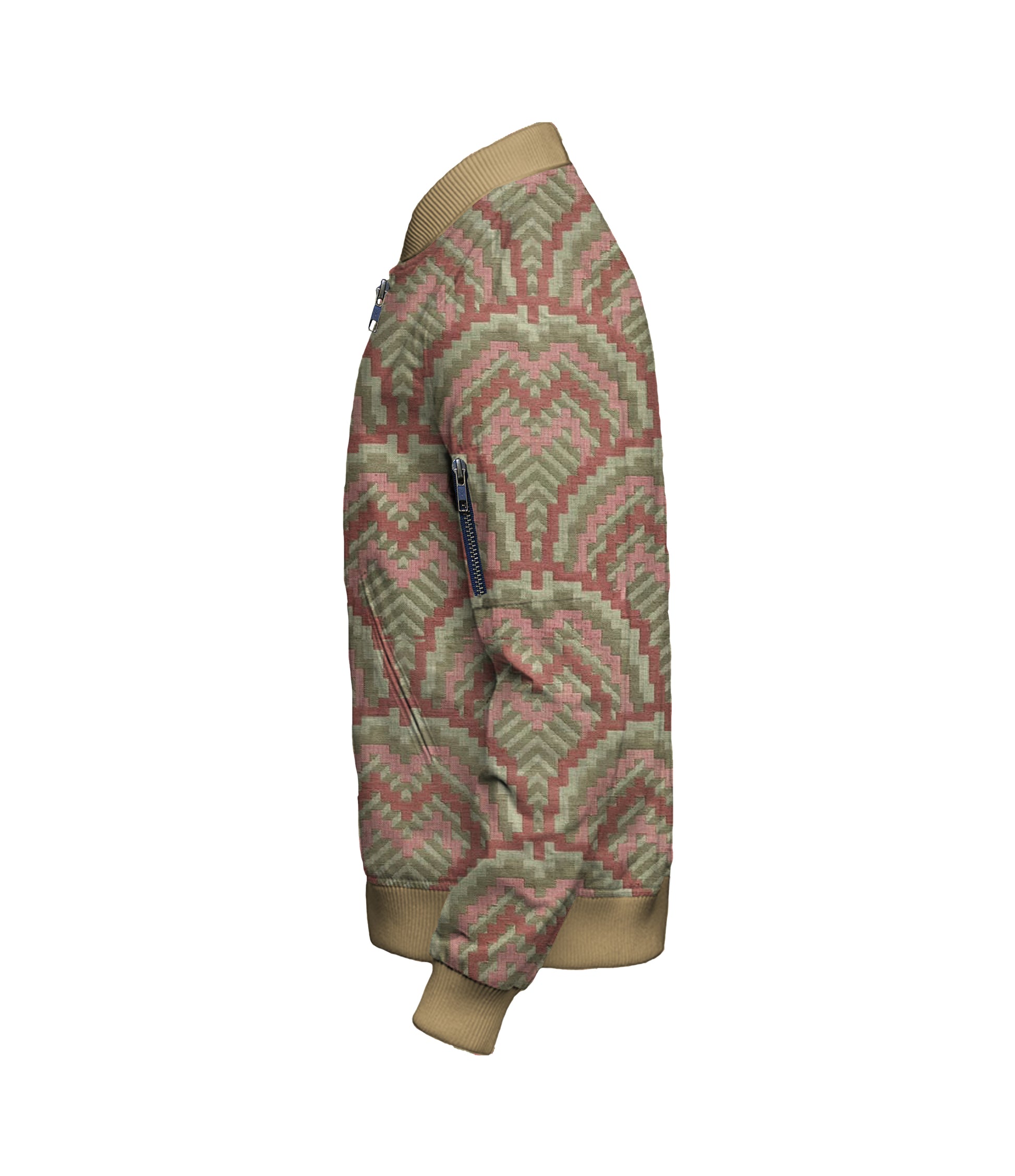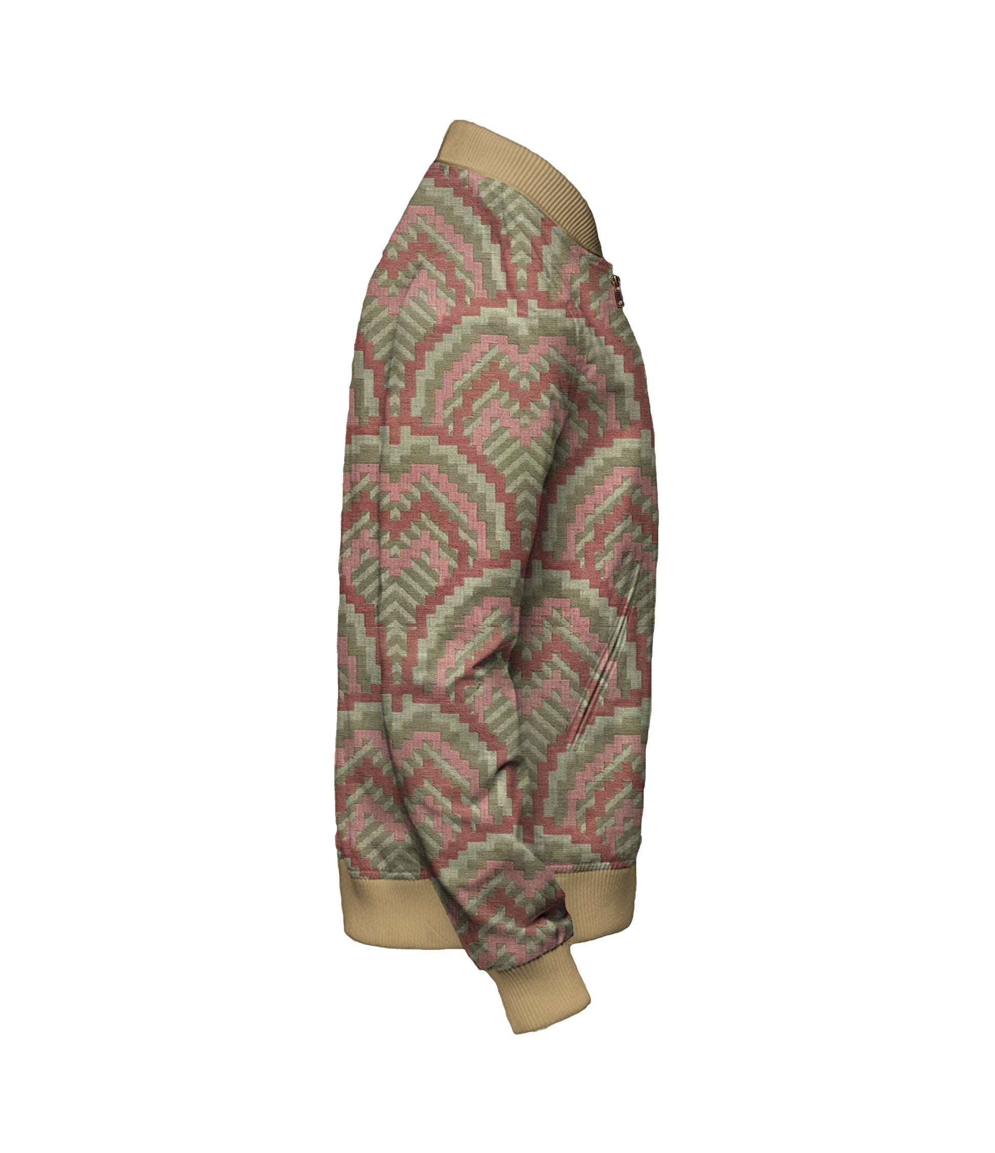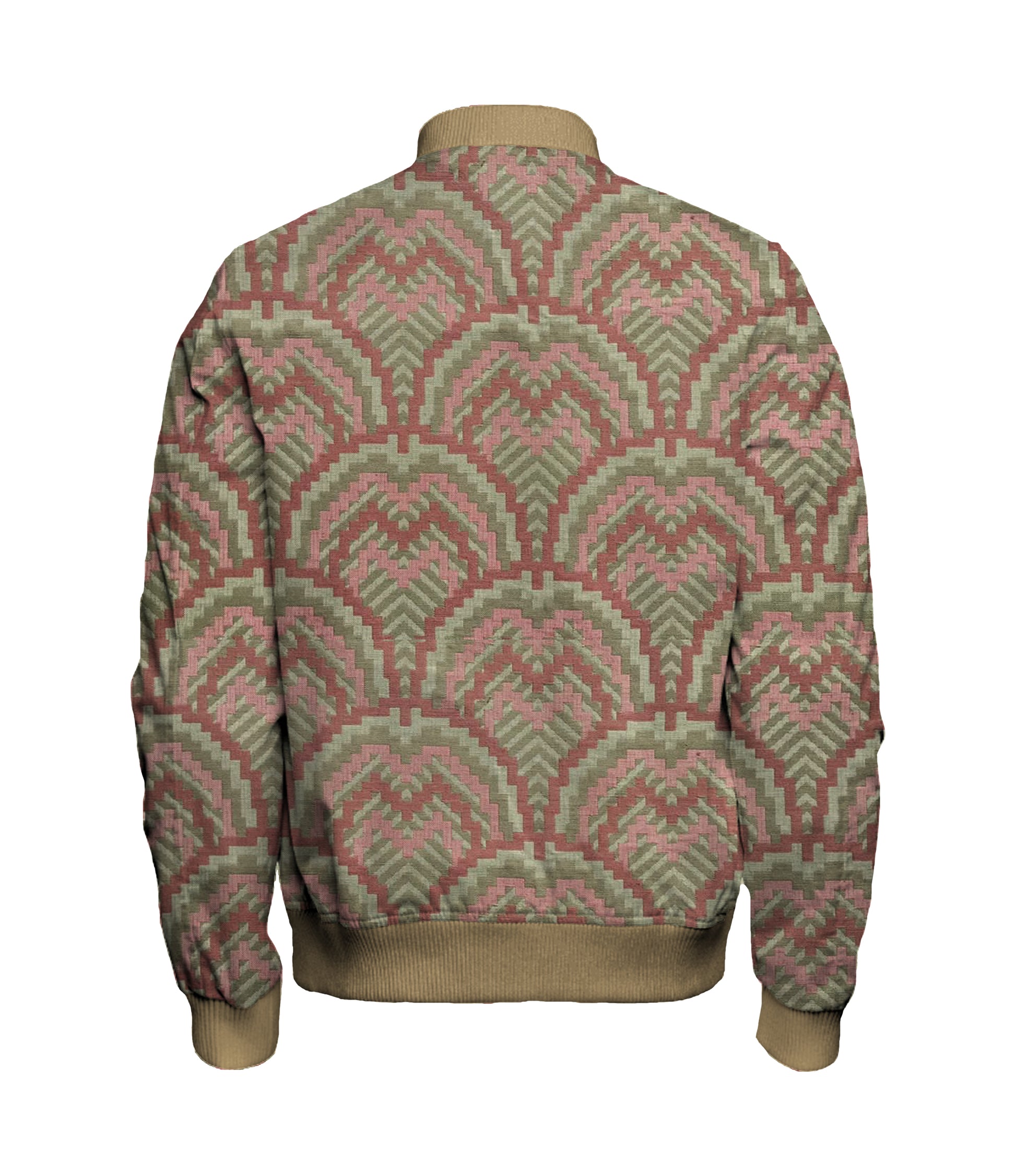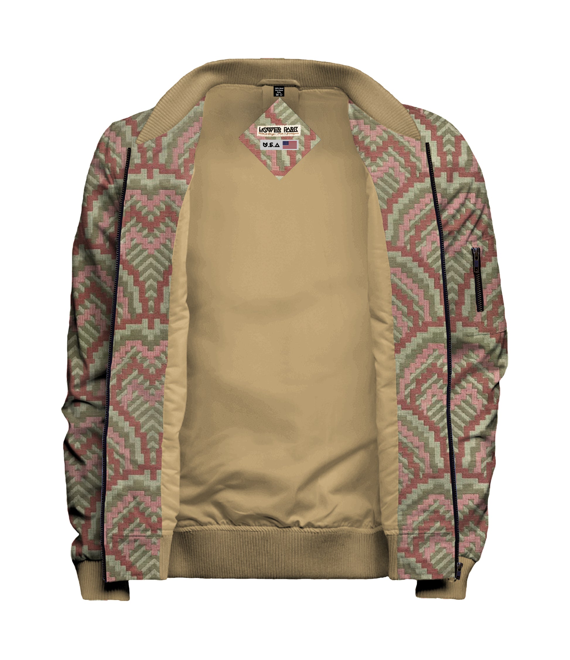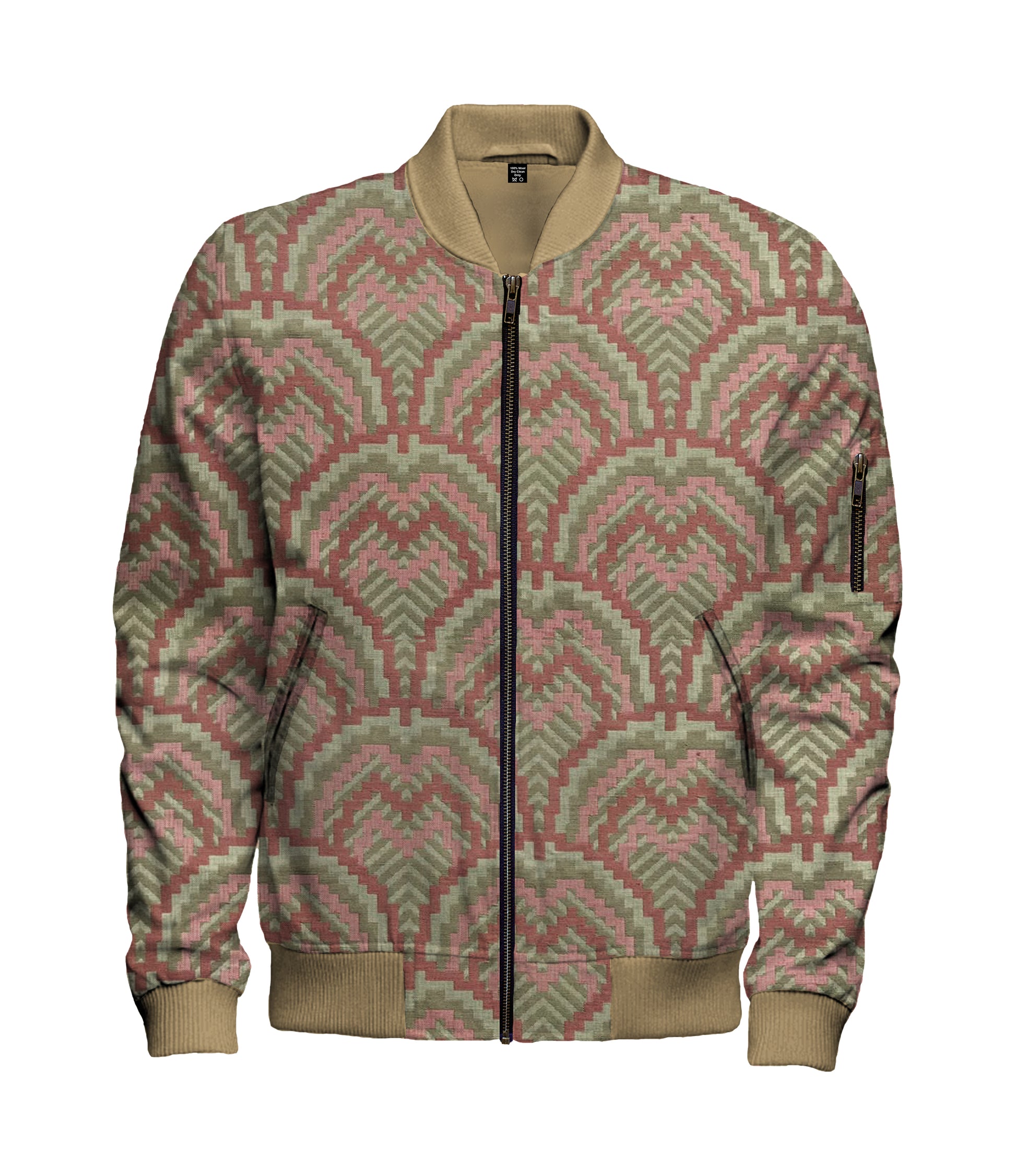 Geo Red Green Bomber Jacket - $200. Custom made to order. This textile is made in the USA and is 100% Polyester. A large size jacket weights 1.5lbs / 24oz.
