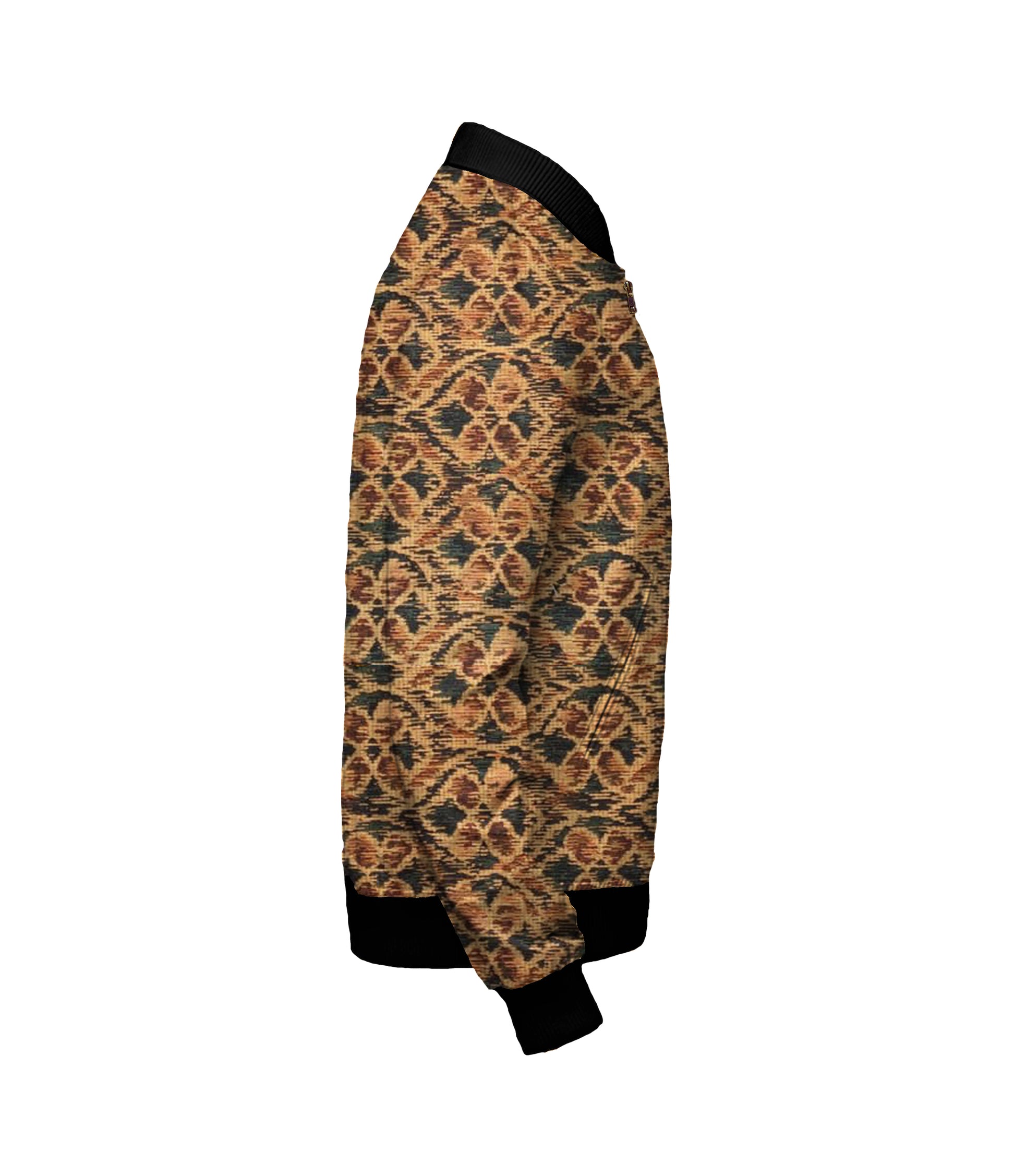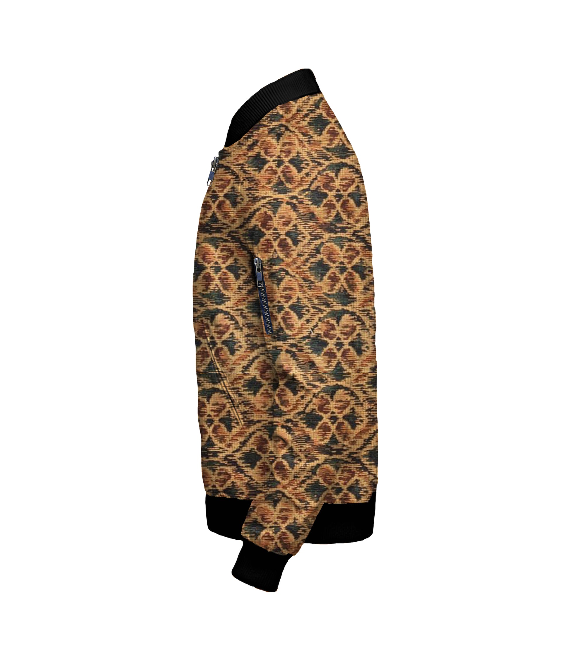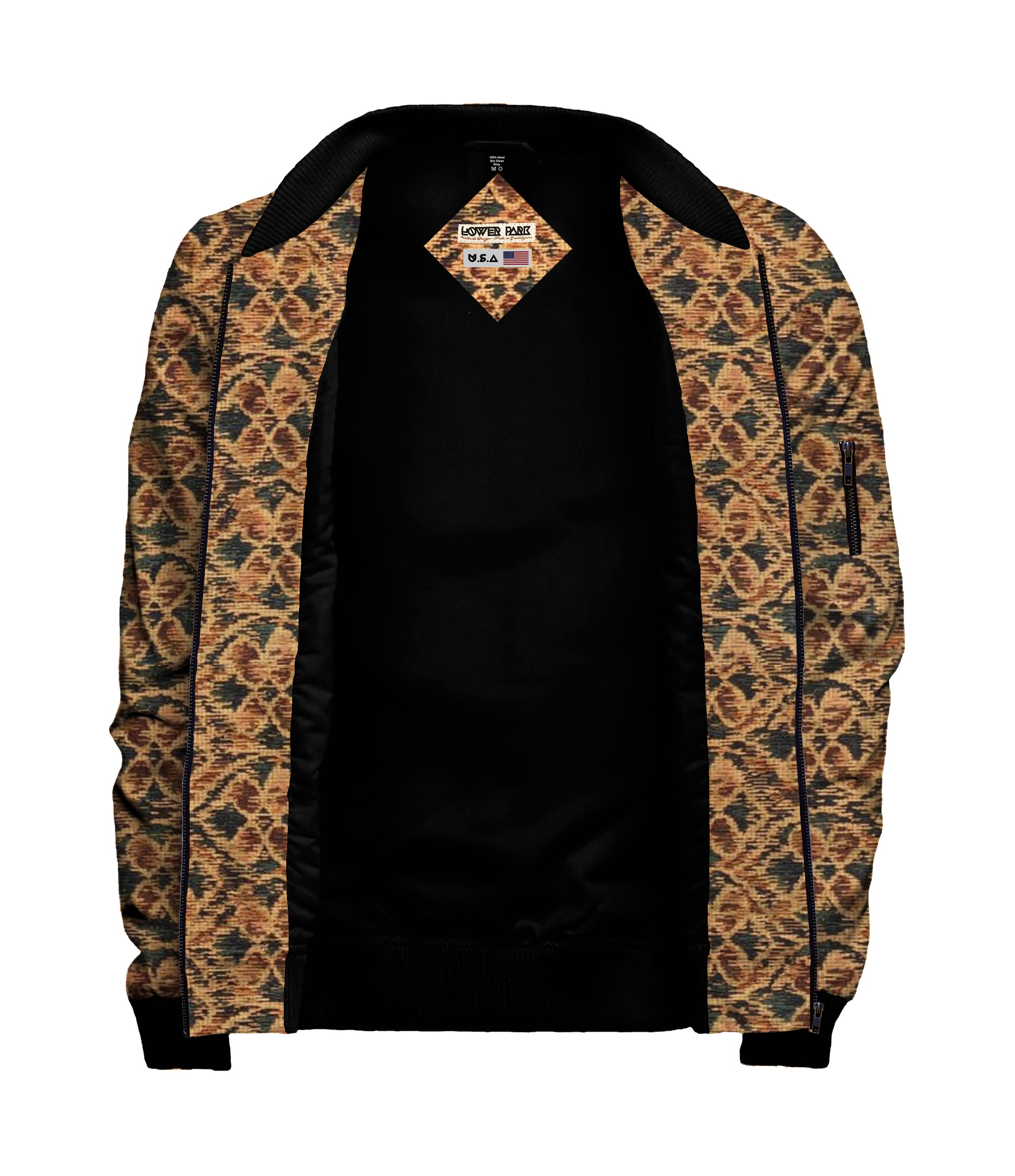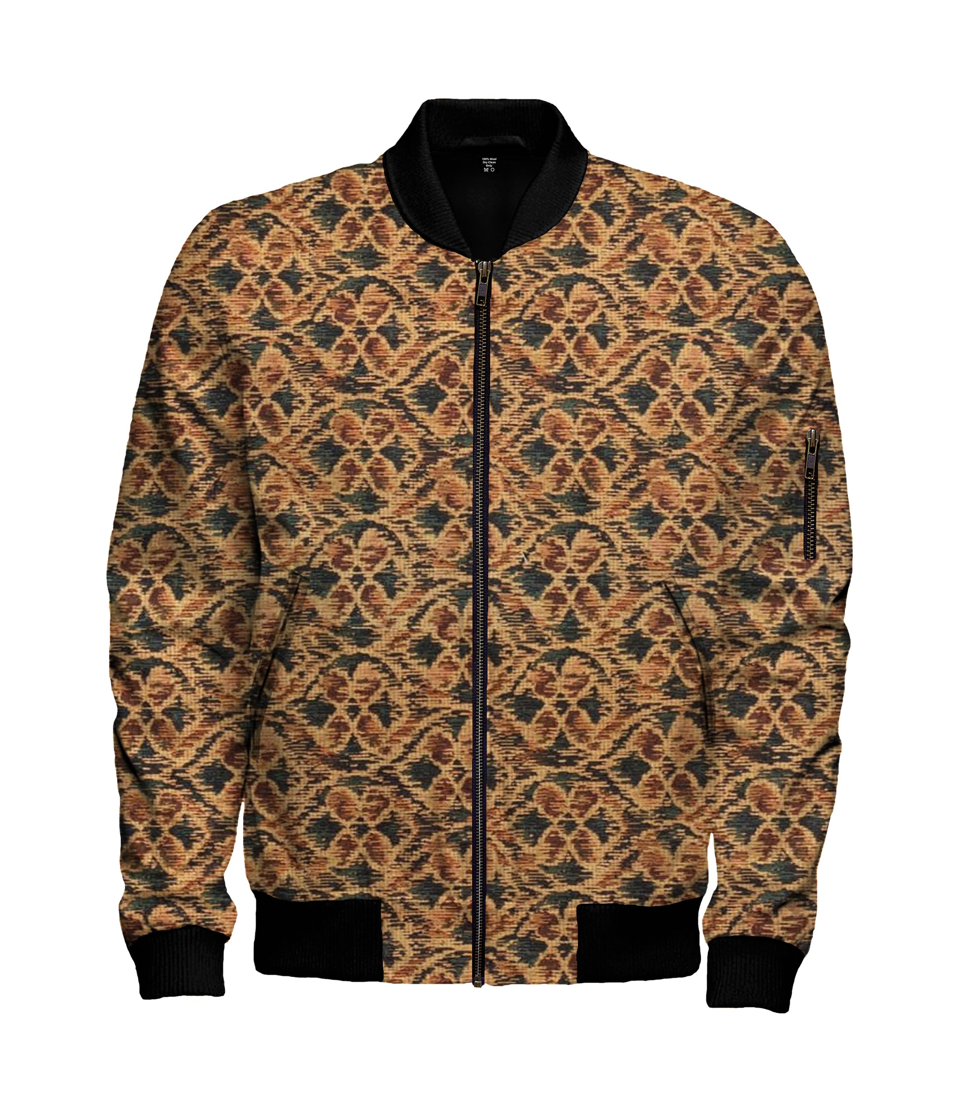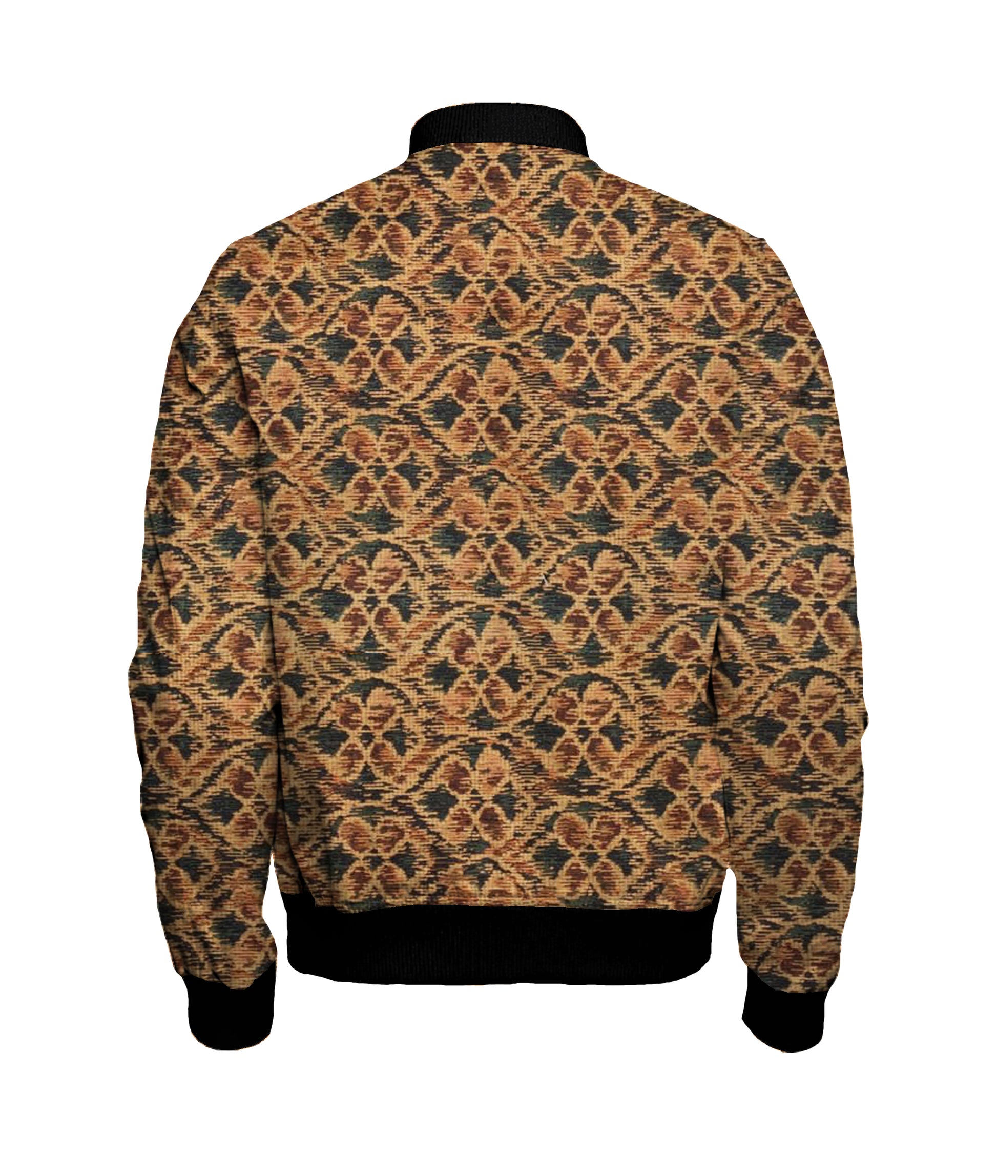 Naranjella Des Bomber Jacket. Custom made to order. This textile is made in the United States and is a 60/40 Polyester/Cotton. A large size jacket weights 1.5lbs / 24oz.