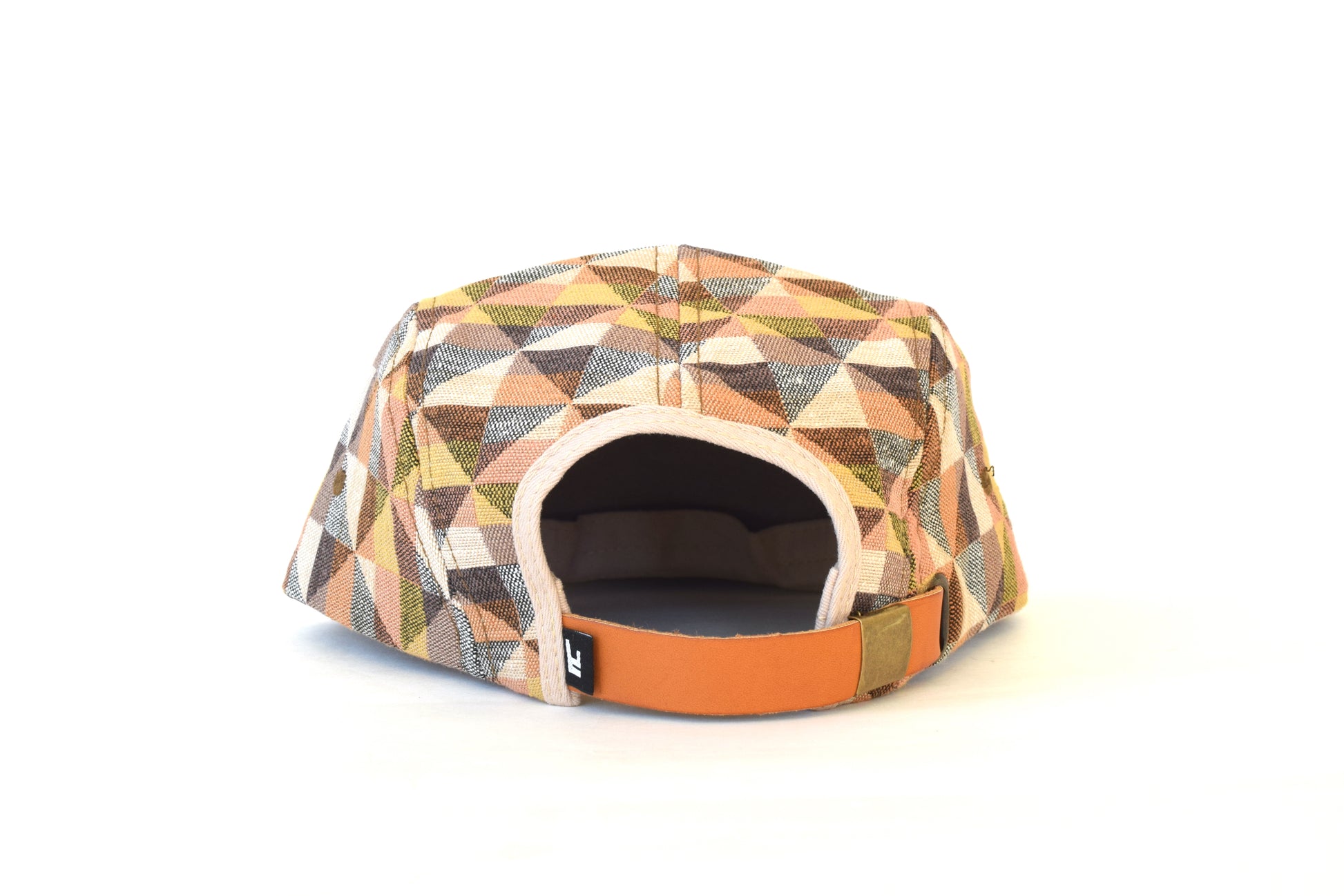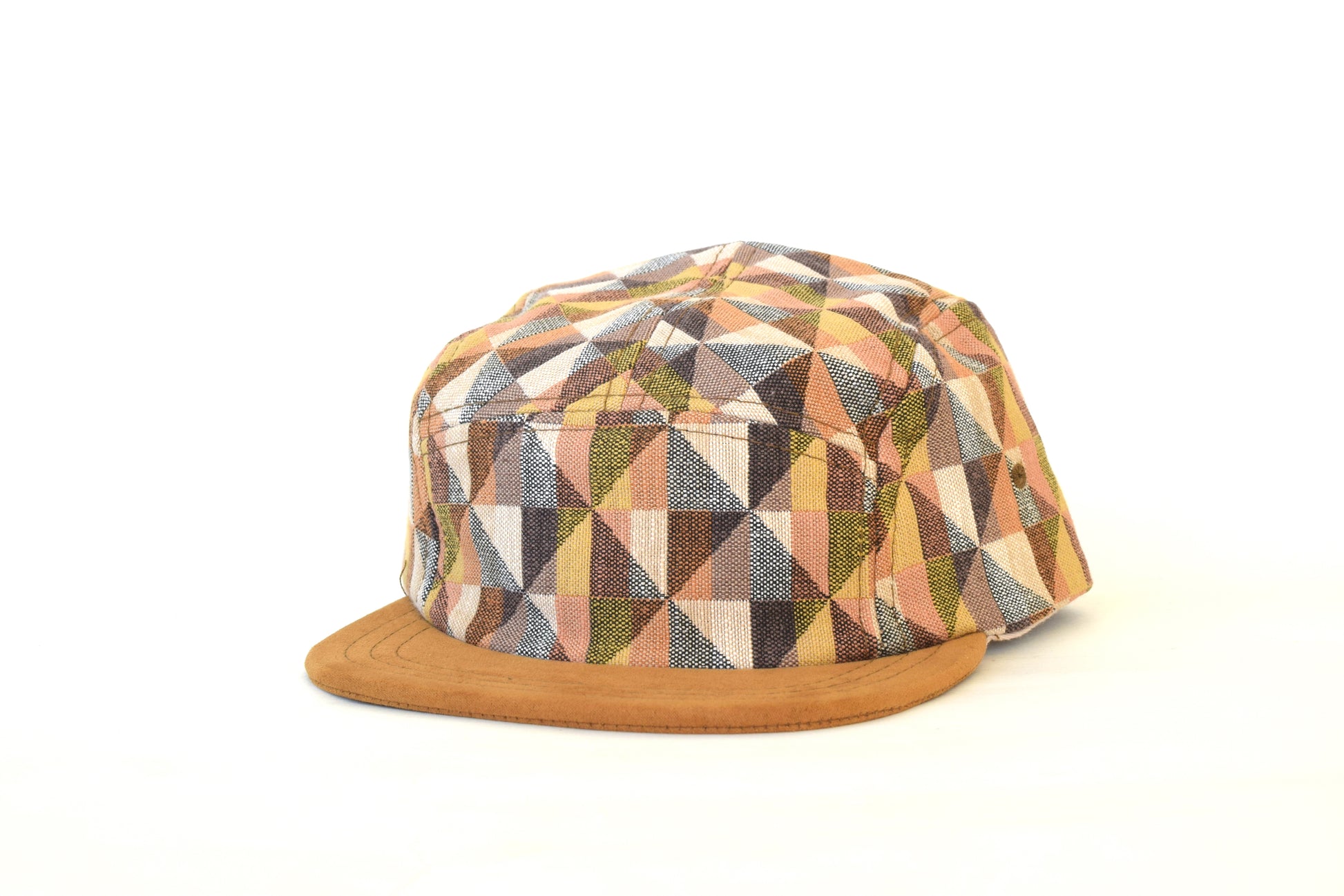 The Trillejido Cafe five-panel hat (short brim) is handmade with fabric from the US.