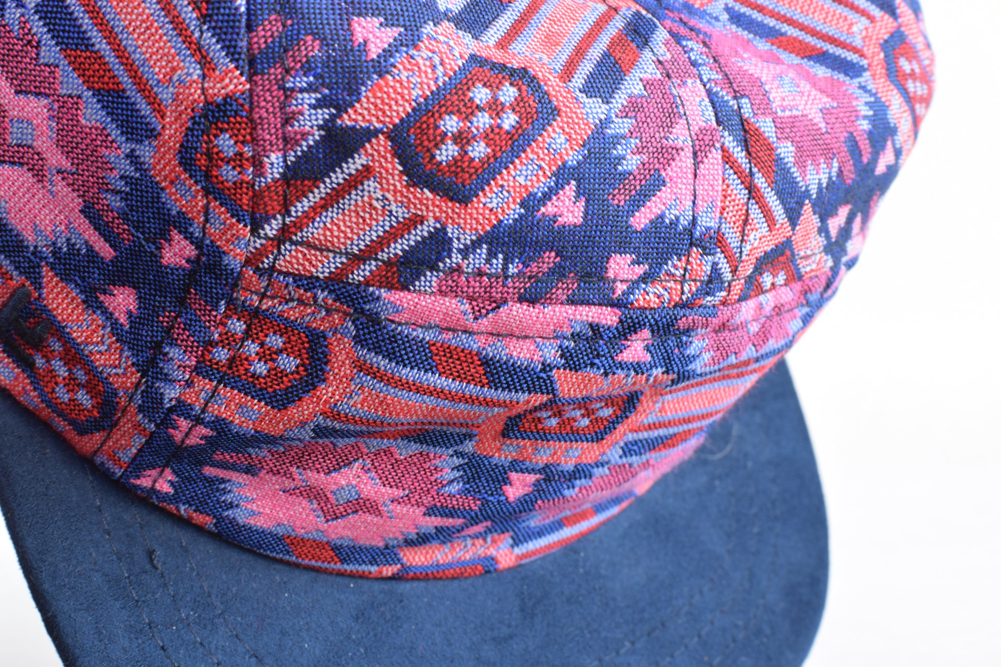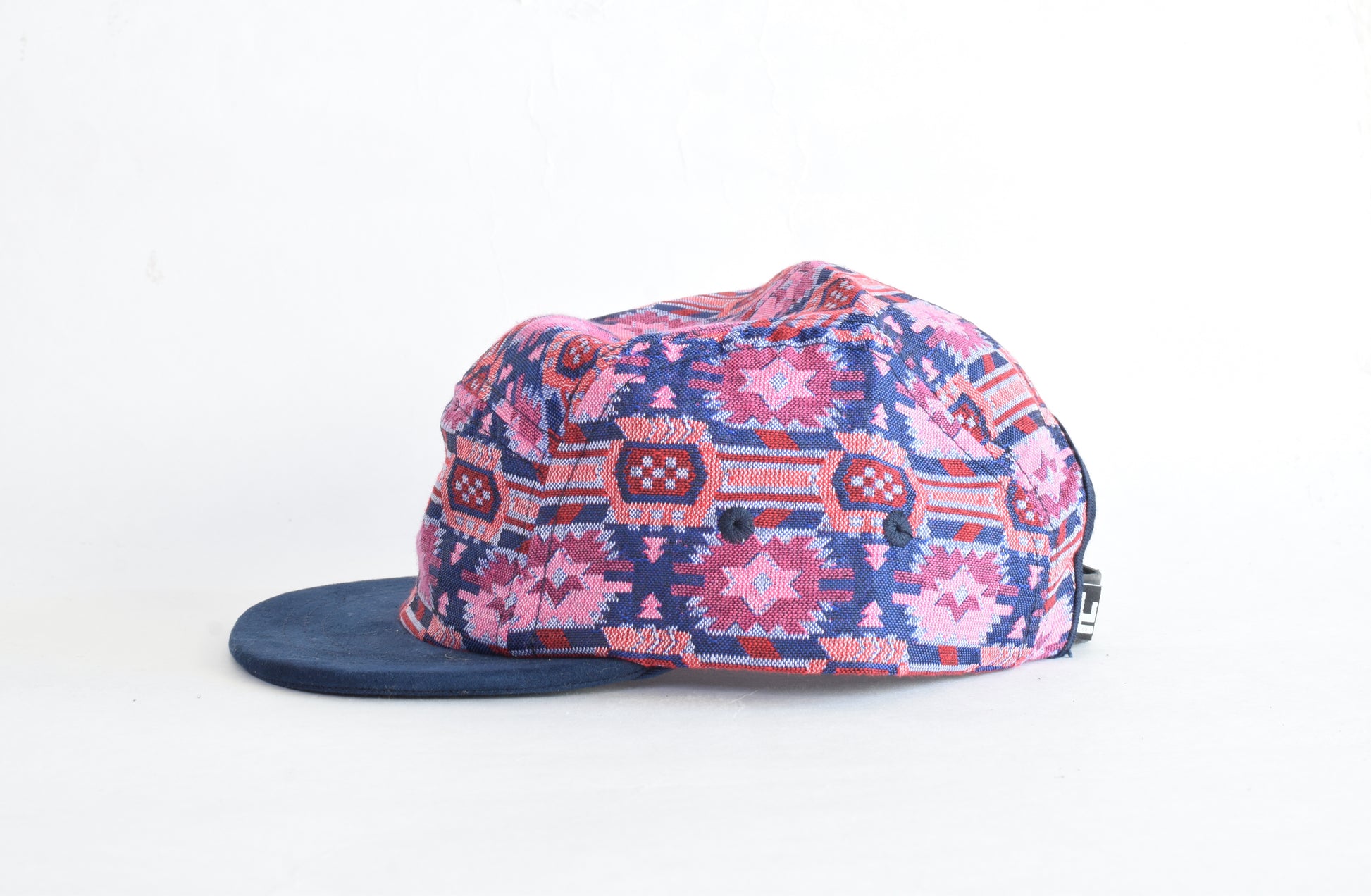 The Tukuche five panel hat (sb) is handmade with a textile from Nepal. Every year the Nepali come out with new patterns and color variations on their traditional textiles. We try to grab a handful each year. This textile was hand woven in Kathmandu in 2025.