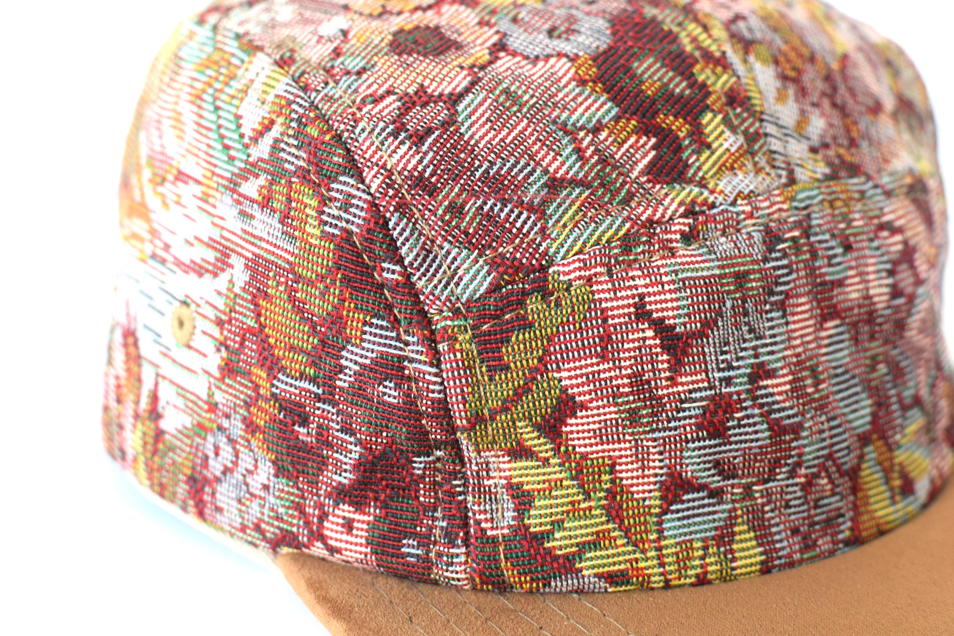 The Xinyi five-panel hat is handmade with a jacquard textile from Taiwan.